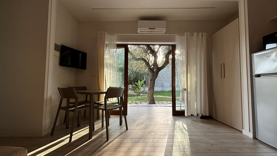 Con la sua camera matrimoniale e la cameretta con 2 letti singoli è la situazione ideale per una famiglia di 4 persone. Oltre all’ampia e luminosa zona giorno ha a disposizione un angolo giardino dove rilassarsi o per pranzare e cenare immersi nella natura.